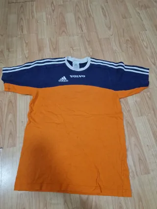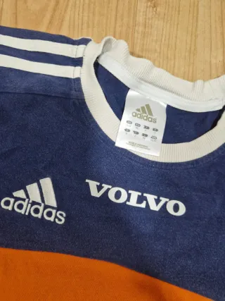 Camisa de manga corta con diseño bicolor. - Parte superior azul marino con detalles de rayas blancas en las mangas. - Parte inferior naranja. - Logo de Adidas y Volvo en la parte frontal.