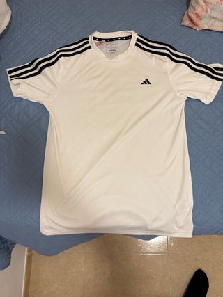 Camiseta deportiva de manga corta de la marca Adidas. - Diseño clásico con las tres rayas icónicas en las mangas. - Logo de Adidas en el pecho. - Tejido transpirable.
