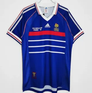 Camiseta de fútbol de la selección francesa, utilizada en el Mundial de 1998. - Diseño clásico con las tres rayas de Adidas en las mangas. - Escudo de la Federación Francesa de Fútbol bordado. - Inscripción FIFA WORLD CUP FRANCE 98 en el pecho.