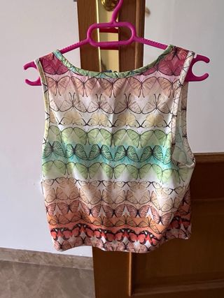 Camiseta sin mangas de Adidas con un estampado vibrante de mariposas en tonos verdes, amarillos y naranjas. Presenta el icónico logo de Adidas en el pecho. - Diseño de tirantes. - Estampado integral de mariposas. - Logo de Adidas en contraste.