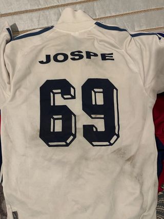 Camisa deportiva blanca con el nombre JOSPE y el número 69. - Diseño con cuello alto. - Detalles de rayas en las mangas.