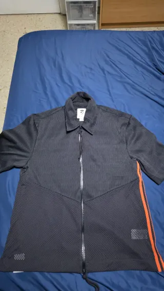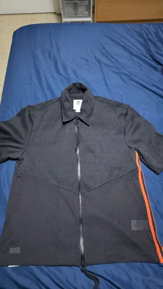Camisa de estilo oversize de la marca Adidas. - Diseño con cremallera frontal. - Paneles de malla en la parte inferior. - Detalles de rayas naranjas en los laterales. - Cuello camisero.