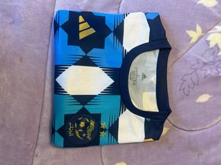 Camiseta de la selección de Argelia con diseño deportivo. - Diseño con patrones geométricos en tonos azules y blancos. - Logo de Adidas y escudo de la selección. - Cuello redondo y mangas cortas.