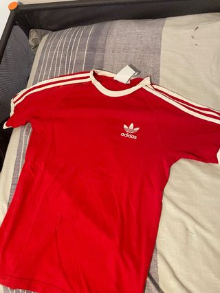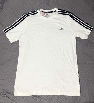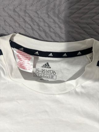 Camiseta de manga corta con el logo de Adidas. - Diseño clásico con las tres rayas en las mangas. - Cuello redondo. - Talla 15/16, equivalente a una S-M de hombre.
