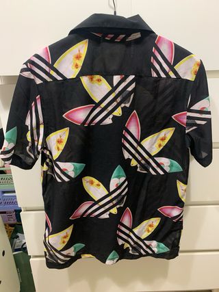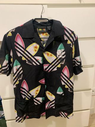 Camisa de manga corta con un llamativo estampado de tablas de surf y el logo de Adidas. - Diseño exclusivo de Adidas x Pharrell Williams. - Estampado multicolor sobre fondo negro. - Cuello camisero clásico. - Dos bolsillos en la parte delantera.