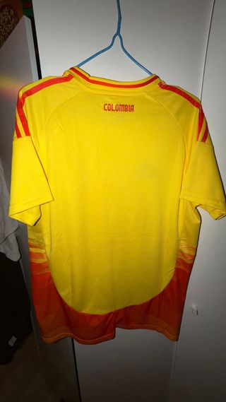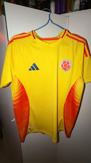 Camiseta de la Selección Colombia de Fútbol. - Diseño con los colores amarillo y naranja. - Logo de Adidas en azul. - Escudo de la Federación Colombiana de Fútbol.