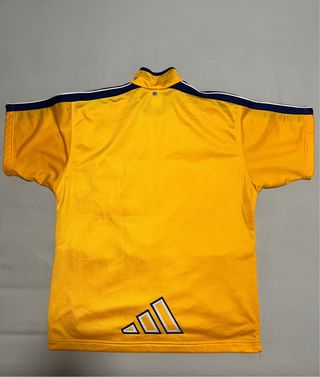 Camisa deportiva vintage de Adidas con un llamativo diseño. - Color amarillo vibrante. - Mangas cortas. - Cuello azul marino. - Rayas azules en las mangas y el cuello. - Dos bolsillos en el pecho con botones. - Logo de Adidas en la parte inferior.