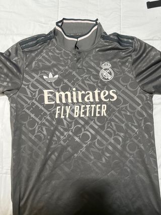 Camisa deportiva de la marca Adidas en color gris. Presenta un diseño moderno con el logo de la marca y el escudo del Real Madrid. - Cuello tipo polo con botones. - Detalles de las tres franjas en los hombros. - Patrón repetido de iniciales en relieve por toda la prenda.