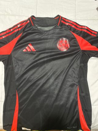 Camisa deportiva Adidas con detalles en rojo. - Diseño con las tres rayas características de Adidas en las mangas. - Panel frontal con el logo de Adidas. - Escudo circular con un balón de fútbol en el pecho. - Tecnología HEAT.RDY para mayor transpirabilidad.