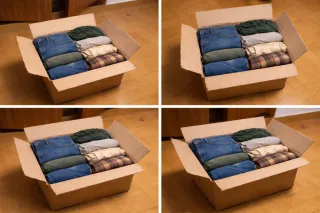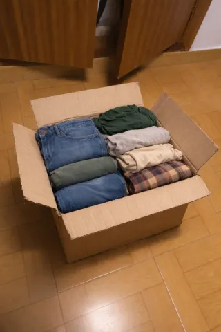 Caja con varias prendas de vestir dobladas, lista para ser reutilizada. - Incluye pantalones vaqueros. - Variedad de camisetas y camisas.