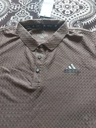 Polo marca Adidas Color negro. Talla XL Es muy elegante y moderno. Nuevo a estrenar pero no tiene etiqueta. El cuello si se vuelve, tiene una decoración en blanco que contrasta con el negro. Tiene un bolsillo de verdad. En las axilas lleva un refuerzo y ventilación. Lleva un botón de repuesto en la etiqueta Está muy bien confeccionado. Medidas: 73,cm de largo y 63cm de ancho.