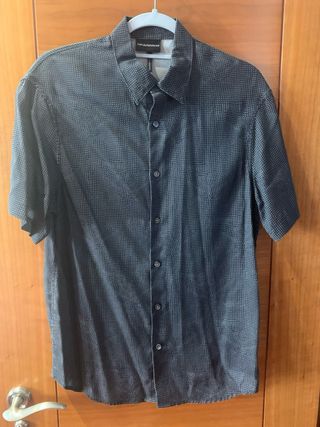 Camisa de manga corta con un diseño geométrico en blanco y negro logo águilade Armani. En perfecto estado. Slim fit, talla M. Hombre 42cm y largo 70cm. La etiqueta interior está cortada y lleva botón de repuesto.