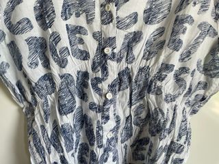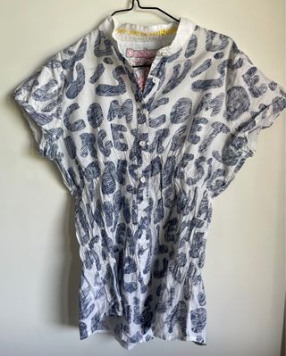 Camisa de manga corta con un llamativo estampado de letras en azul y blanco. El diseño presenta un cuello mao y cierre de botones. 100% algodon.