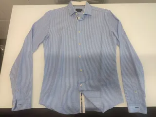 Camisa de manga larga con un diseño de rayas finas en tonos azules y blancos. Es una prenda clásica y versátil. - Cuello camisero. - Cierre de botones. - Corte entallado.