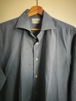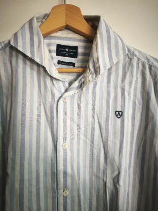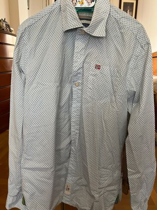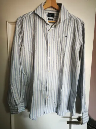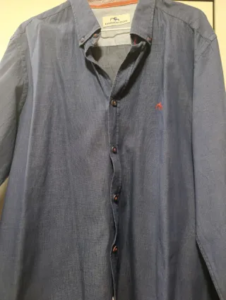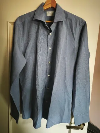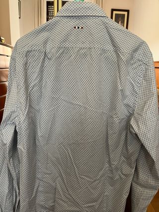Camisa de manga larga con un discreto estampado. - Corte slim fit. - Cuello clásico. - Cierre de botones. - Pequeño logo de la marca en el pecho. - Punto de colores Azul y rojo borados en la camisa. Muy bien cuidada y con muy poco uso, Se vende por al talla que ya no vale. Si tiene alguna duda no dude en preguntar.