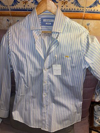 Camisa de manga larga con un diseño de rayas verticales en tonos azules y blancos. Presenta el icónico logo de la marca bordado en el pecho. Poco uso