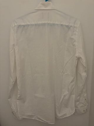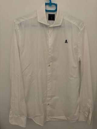 Camisa de vestir de la marca Scalpers en color blanco. Presenta un discreto logo bordado en el pecho en color azul oscuro. Talla 40. Ancho hombros 46cm, ancho cuerpo 55cm, largo cuerpo 66cm, largo manga 69cm. Sin etiquetas.