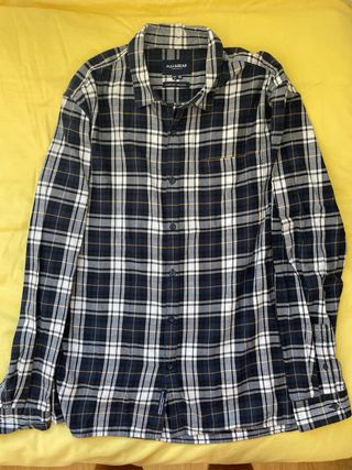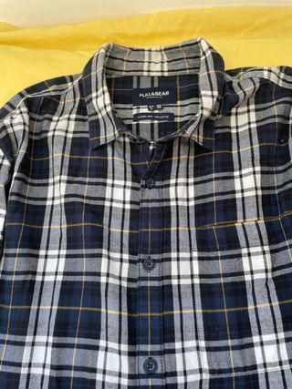 Camisa de cuadros de la marca Pull&Bear. Un clásico para cualquier armario. - Diseño a cuadros en tonos azules, blancos y amarillos. - Cuello camisero. - Cierre de botones. - Un bolsillo en el pecho.