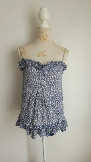 Elegante top de seda de Sita Murt. - Diseño con tirantes finos. - Volantes en el escote y el bajo. - Estampado de abanicos en azul y blanco.