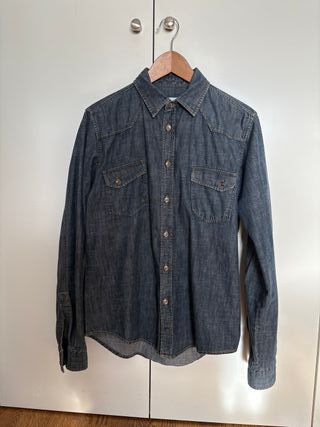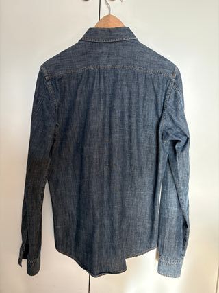 Camisa azul, con bolsillos y botones frontales. También se puede remangar. Tiene pespuntes y cuello inferior de polipiel (algunas zonas desgastadas pero como queda por debajo, no se ve). Talla M. Ideal para combinar con vaqueros y pantalones negros.