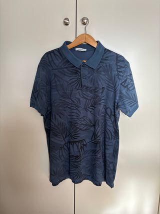 Camisa polo de manga corta con un diseño de hojas en tonos azules y negros. - Cuello tipo polo. - Cierre de botones.