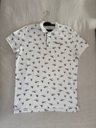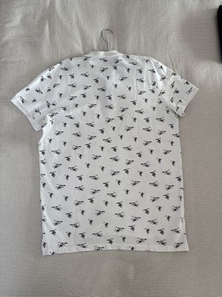 Camisa polo de manga corta con un diseño original. - Estampado de figuras en azul marino. - Cuello tipo polo con botones. - Detalle de ribetes en las mangas y bajo.