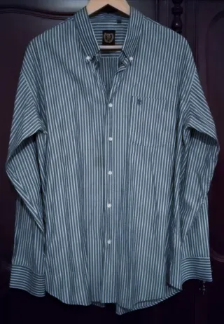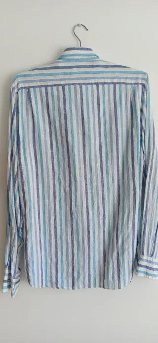 Camisa de manga larga con un diseño de rayas verticales en tonos azules y blancos. Presenta un cuello de camisa clásico y cierre de botones. - Diseño de rayas verticales. - Cuello de camisa. - Cierre de botones. - Tiene una mancha leve que se puede apreciar y está marcada en las fotografías. - A parte de eso está en perfectas condiciones.