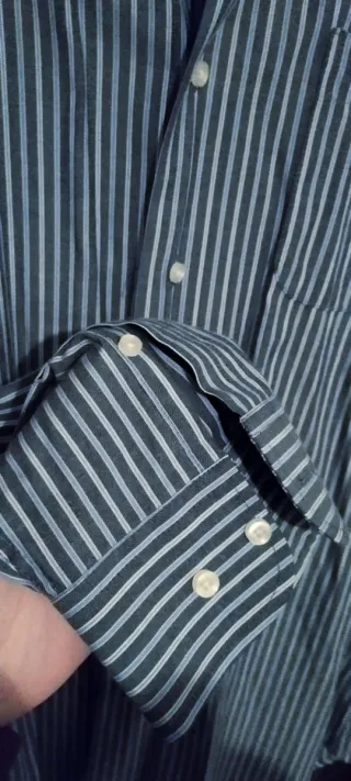 Camisa de manga larga con un diseño de rayas finas en azul. Presenta un bolsillo en el pecho y detalles en los hombros. Muy poco uso. - Cuello camisero. - Cierre de botones. - Puños abotonados.