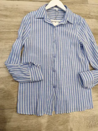 Blusa, camisa de algodón con un diseño de rayas verticales en azul y blanco. Es una prenda ligera, cómoda, y muy suave 💘Sienta genial con vaqueros!!! - Cuello camisero. - Cierre de botones. - Mangas largas con puñosy botones para llevarla remangada - Bajo con aberturas laterales. Talla m, nueva sin estrenar, con etiqueta