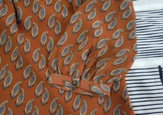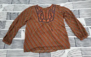 Blusa de manga larga con un bonito estampado. - Diseño con cuello en V y detalles bordados. - Estampado de estilo paisley en tonos tierra y azul. -Tejido que no requiere planchar. Talla L equivale 40-42 (ver los cm en la foto) queda muy favorecedora. Caida ancha, queda abierta por abajo. Valor en tienda 29,99€