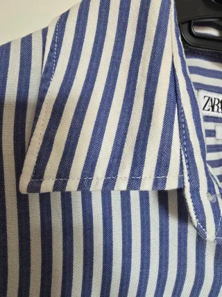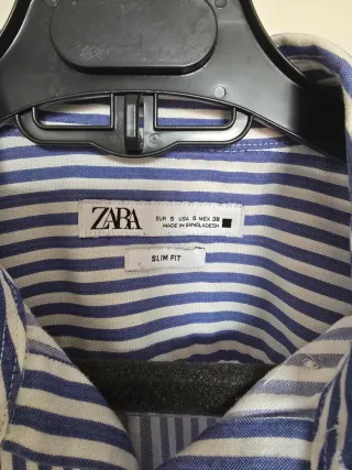 Camisa de la marca ZARA con un diseño de rayas verticales en tonos azul y blanco. Presenta un corte Slim Fit que se ajusta al cuerpo. - Diseño de rayas azules y blancas. - Corte Slim Fit. - Fabricada en Bangladesh.