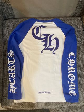 Camiseta de manga larga con diseño raglán en dos tonos. - Mangas de color azul. - Cuerpo principal en color blanco. - Logo de Chrome Hearts en el pecho. - Inscripción Chrome Hearts en las mangas.