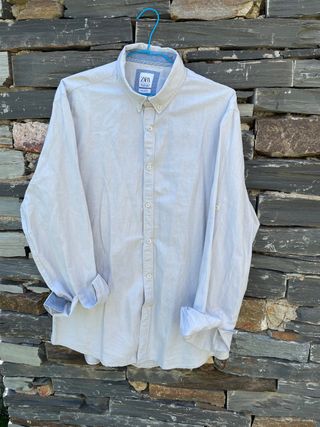 Camisa de manga larga para hombre de Zara. Talla L de corte slim fit - Diseño de cuello mao. - Raya vertical azul en la parte frontal. - Tejido ligero, ideal para climas cálidos. Los puños al darles la vuelta tienen el mismo ribete a ratas azul qye en la abotonadura central. Cualquier cosa no dude en preguntar. Mas cosas en mi perfil. Gracias