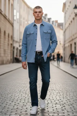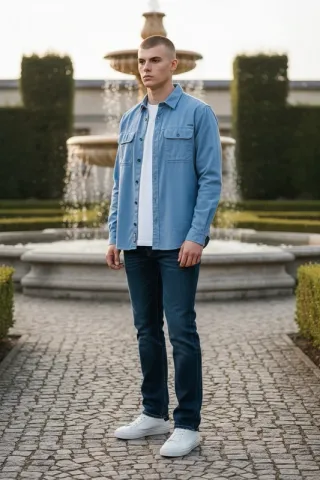 Camisa vaquera de manga larga. - Cuello camisero. - Cierre de botones. - Bolsillo en el pecho.