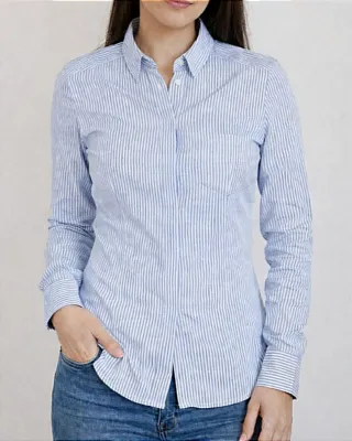 Camisa H&M, talla 34, de manga larga en color azul claro con rayas finas blancas. Corte entallado, cuello clásico y cierre con botones ocultos, bolsillo delantero. Tejido suave y cómodo, ideal para looks formales o casuales. En perfecto estado. - Cuello camisero.