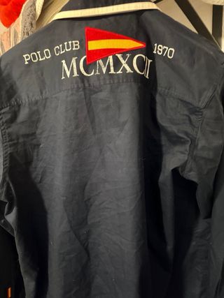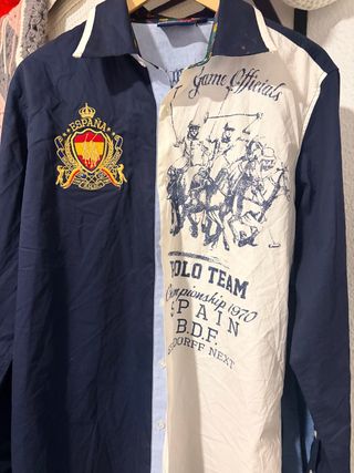 Camisa de manga larga con un diseño único que combina dos paneles. - Panel izquierdo azul marino con escudo de España bordado. - Panel derecho blanco con estampado gráfico de Polo Team y Game Officials. - Cuello camisero. - Cierre de botones.