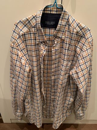Camisa de manga larga Solera de cuadritos, azul claro, cuello con botones y botón trasero, marca talla XXL pero realmente es una XL, da poca talla, por eso la vendo, uso XXL. Como nueva, casi sin usar. - Cuello tipo button-down. - Logo bordado en el pecho. - Cierre de botones.