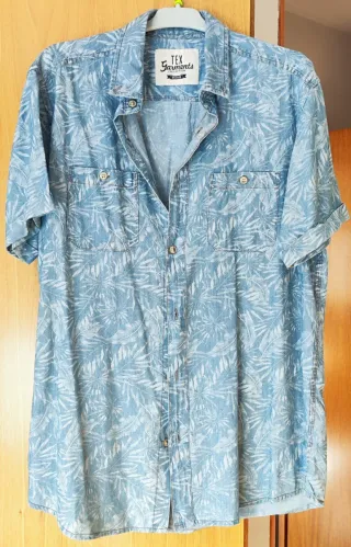 Camisa de manga corta con diseño. - Estampado de hojas en tonos azules y blancos. - Cuello camisero. - Cierre de botones. - Dos bolsillos en el pecho.