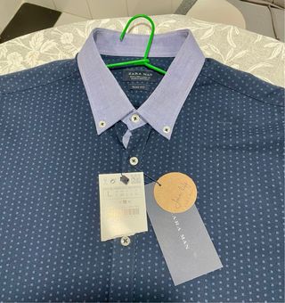 Camisa Zara Hombre Manga Corta Estampada Azul