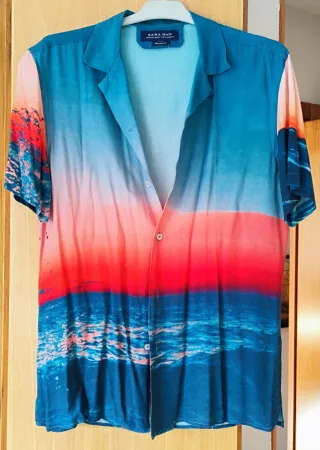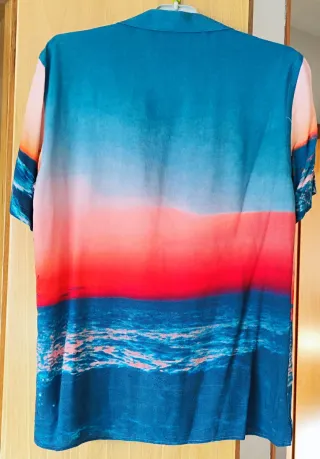 Camisa de manga corta con un diseño vibrante y veraniego. - Estampado degradado de azul a rojo con motivos de agua. - Cuello camisero. - Cierre de botones.