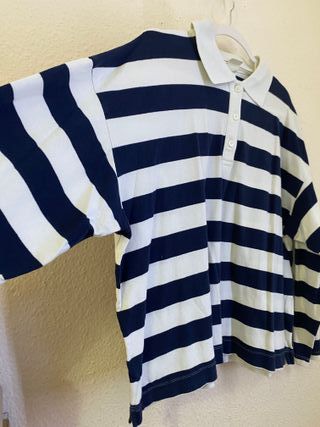 Camisa de manga larga con cuello tipo polo y corte oversize. - Diseño de rayas horizontales en azul marino y blanco. - Cierre de botones en la parte delantera. - Cuello de camisa clásico.