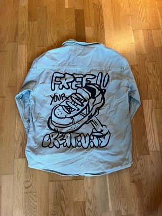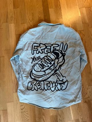 Camisa vaquera de ZARA con un diseño gráfico llamativo en la espalda. - Estampado Free Your Creativity con zapatilla. - Color azul claro. - Cuello camisero.