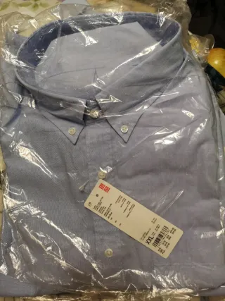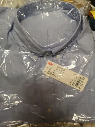 Camisa de vestir UNIQLO de manga larga, con cuello abotonado y etiqueta. - Tejido de algodón Oxford. - Color azul claro. - Talla XXL (48/58).