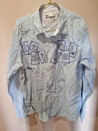 Camisa de manga larga con un diseño original. - Estampado de rayas verticales en tonos azules y verdes. - Detalle bordado con la palabra Desigual y un diseño gráfico. - Cuello clásico y cierre de botones.