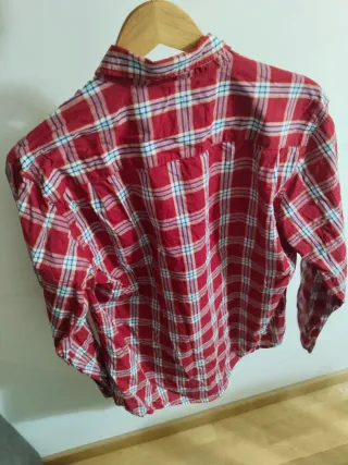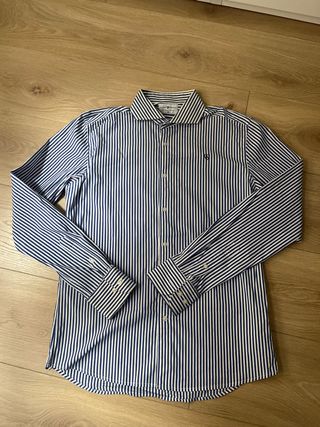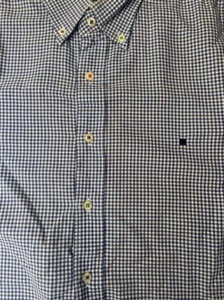 Camisa de manga larga con estampado de cuadros. - Diseño de cuadros pequeños en tonos azul y blanco. - Cuello con botones. - Logo bordado en el pecho. Puesta una vez. Se entrega en mano en Oviedo.