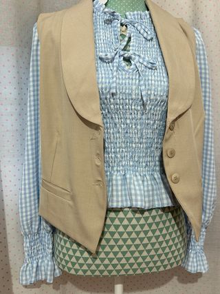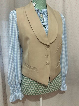 Conjunto de chaleco beige y camisa de manga larga con estampado de cuadros. - Chaleco con cuello solapa y cierre de botones. - Camisa con cuello lazo y puños fruncidos.
