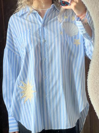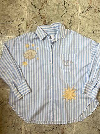 Camisa oversize de la marca Wiya con un diseño de rayas azules y blancas. Presenta bordados de un sol, una concha y estrellas. - Mangas largas con aberturas. - Cuello camisero. - Cierre de botones.