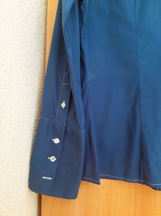 Elegante camisa de manga larga en tono azul, con un diseño que resalta por sus costuras decorativas en blanco.Pequeño volante en cuello y escote. Botones con presillas ocultas hasta la cintura aproximadamente y el resto cerrado con corchetes. No lleva la etiqueta de talla pero corresponde a una 40. Le falta el corchete inferior