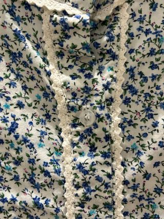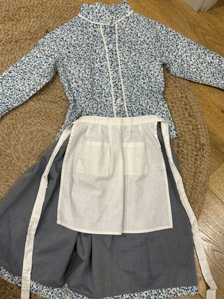 Traje de casera para niña con estampado floral. - Diseño con flores azules y blancas. - Adornado con encaje blanco. talla 6 -8 años viene con falda, camisa y delantal