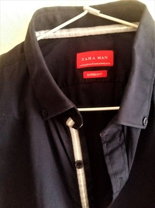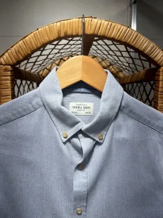 Camisa de vestir de la marca Zara, de color azul y corte slim fit. - Cuello con botones. - Manga larga. - Cierre de botones en la parte frontal.